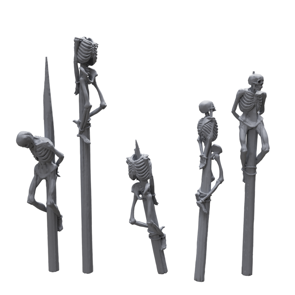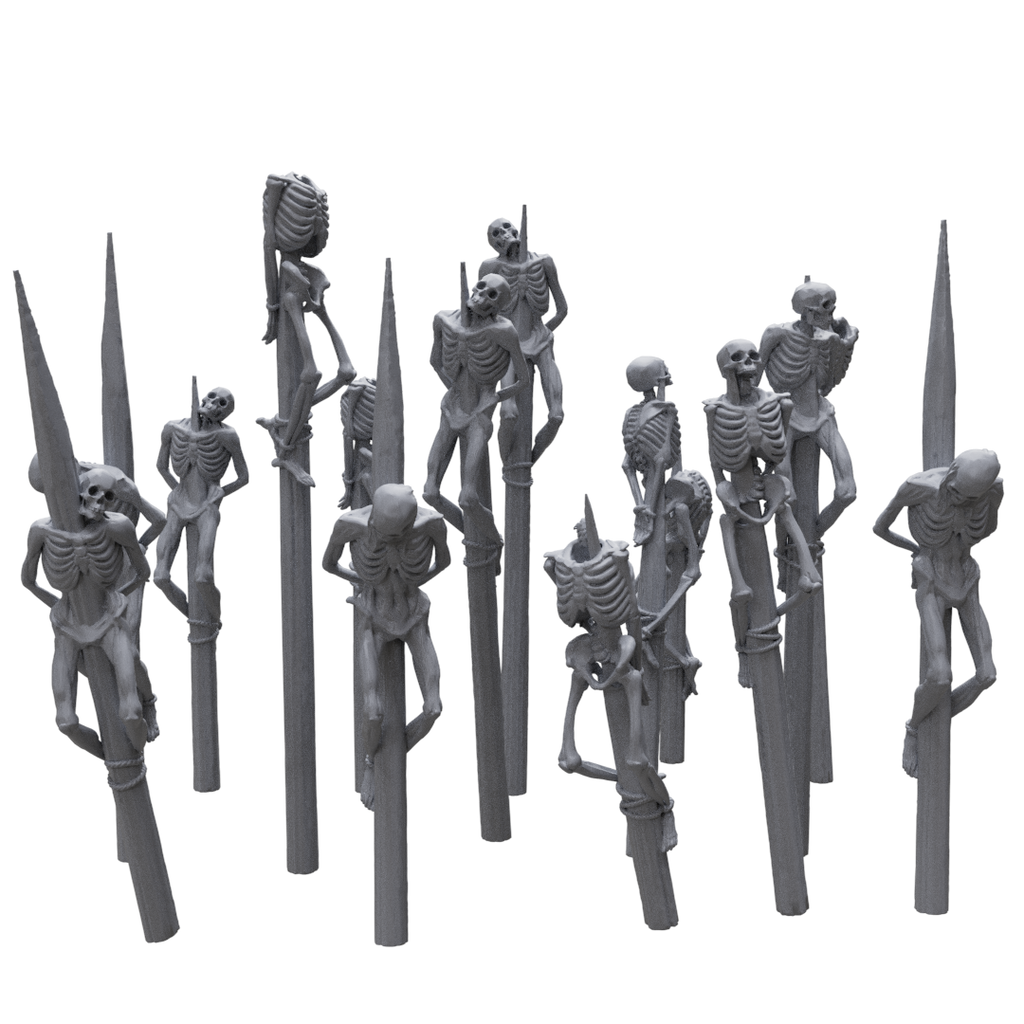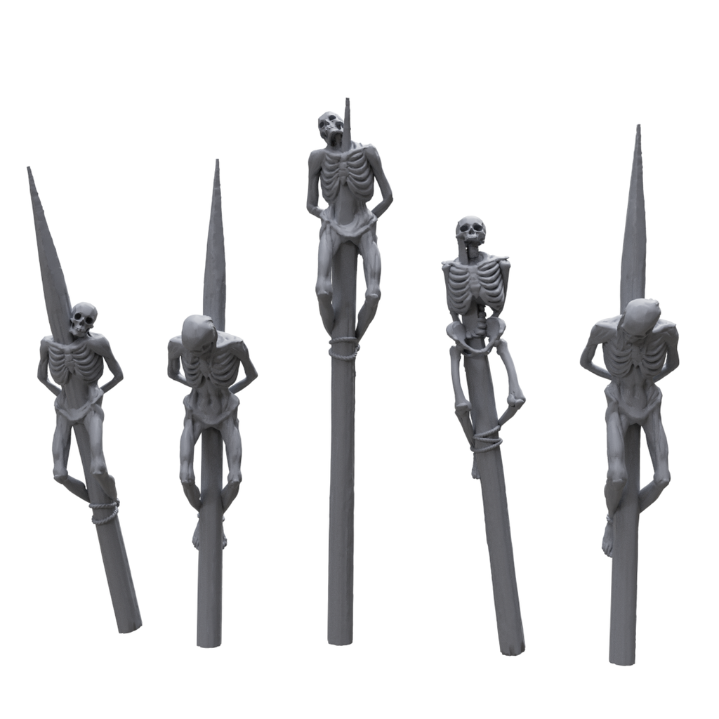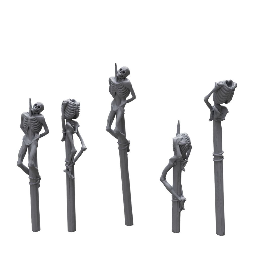 Ideal for wargame enthusiasts looking to add a unique and horrifying touch to their miniature bases and terrain. These impaled skeletons will elevate the visual storytelling of your battles, creating a more immersive and captivating gaming experience.